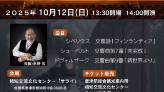 日時:2025年10月12日 日曜日 13:30開場 14:00開演会場:相知交流文化センター サライホール 佐賀県唐津市相知町中山3600-8 TEL 0955-62-3111指揮:永野 哲曲目 <第1部> シベリウス作曲...